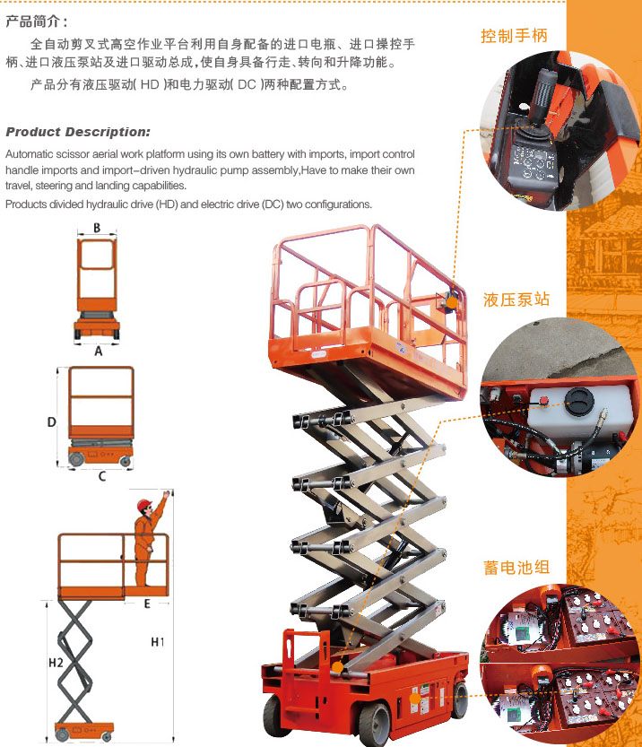 全自動剪叉式高空作業(yè)平臺利用自身配備的進(jìn)口電瓶、進(jìn)口操控手柄、進(jìn)口液壓泵站及進(jìn)口驅(qū)動總成,使自身具備行走、轉(zhuǎn)向和升降功能。